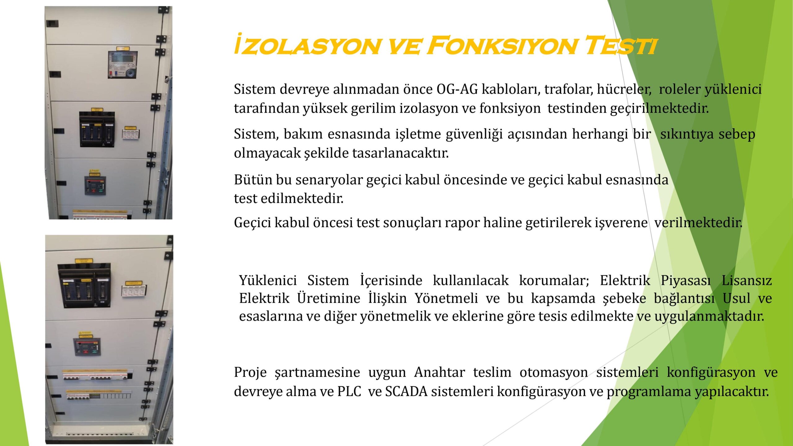 Yüklenici sistem içerisinde kullanılacak olan koruma elemanları; elektrik piyasasında lisanssız elektrik üretimine ilişkin yönetmeliğe ve bu kapsamda şebeke bağlantısı ulus ve esaslarına ve diğer ilgili yönetmelik ve eklerine göre tesis edilmekte ve çalıştığı kanıtlanmaktadır.